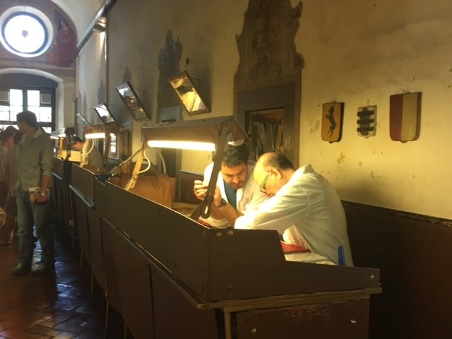 As you browse the various leather goods, the craftsman work on the their upcoming pieces right in the middle of the hallway at their stations. Various items such as wallets, belts, purse straps, come with the option of having them hot stamped by the artisans right in front of you. Below is a photo of an artisan hot stamping a belt. He explained to Handsome Properties International that he’s been working at the school for 7 years and has 13 more years until he becomes a master craftsman! If you have the chance to visit Florence, this is one spot you cannot miss!